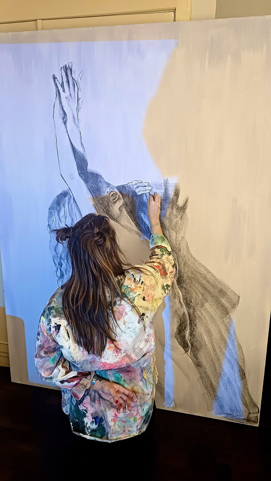 Dança cósmica 150x200 cm. 2023 Acrílica, gesso e carvão vegetal sobre tela.